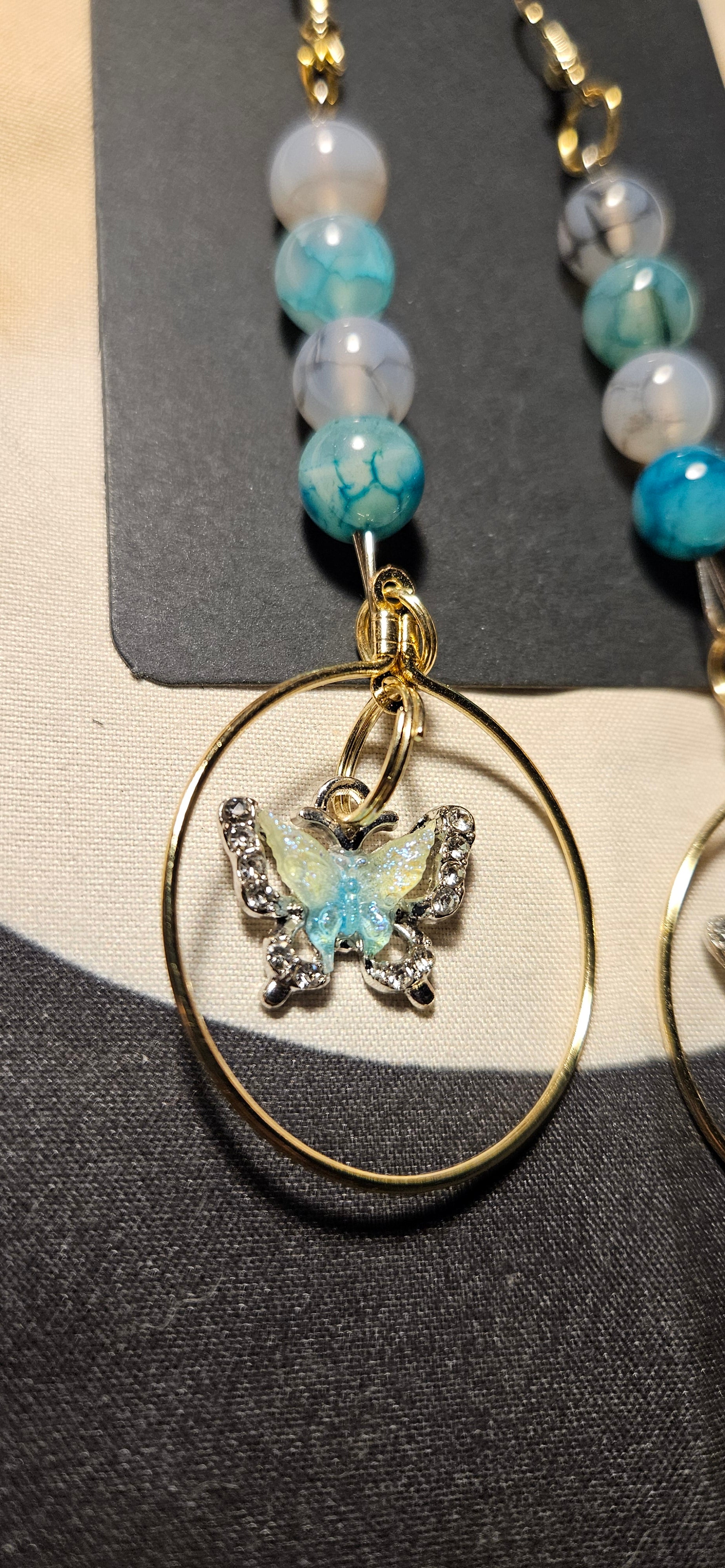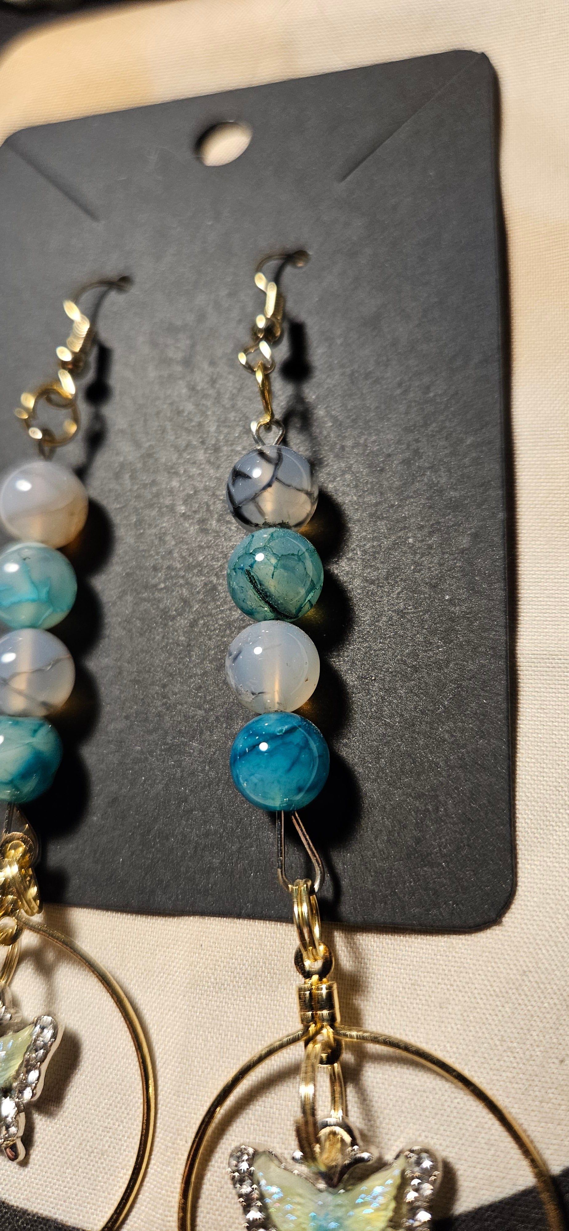 A lovely pair of Black and Green Dragon Agate earrings, sized in 8mm beads, with beautiful butterfly charms in hoop earrings.
