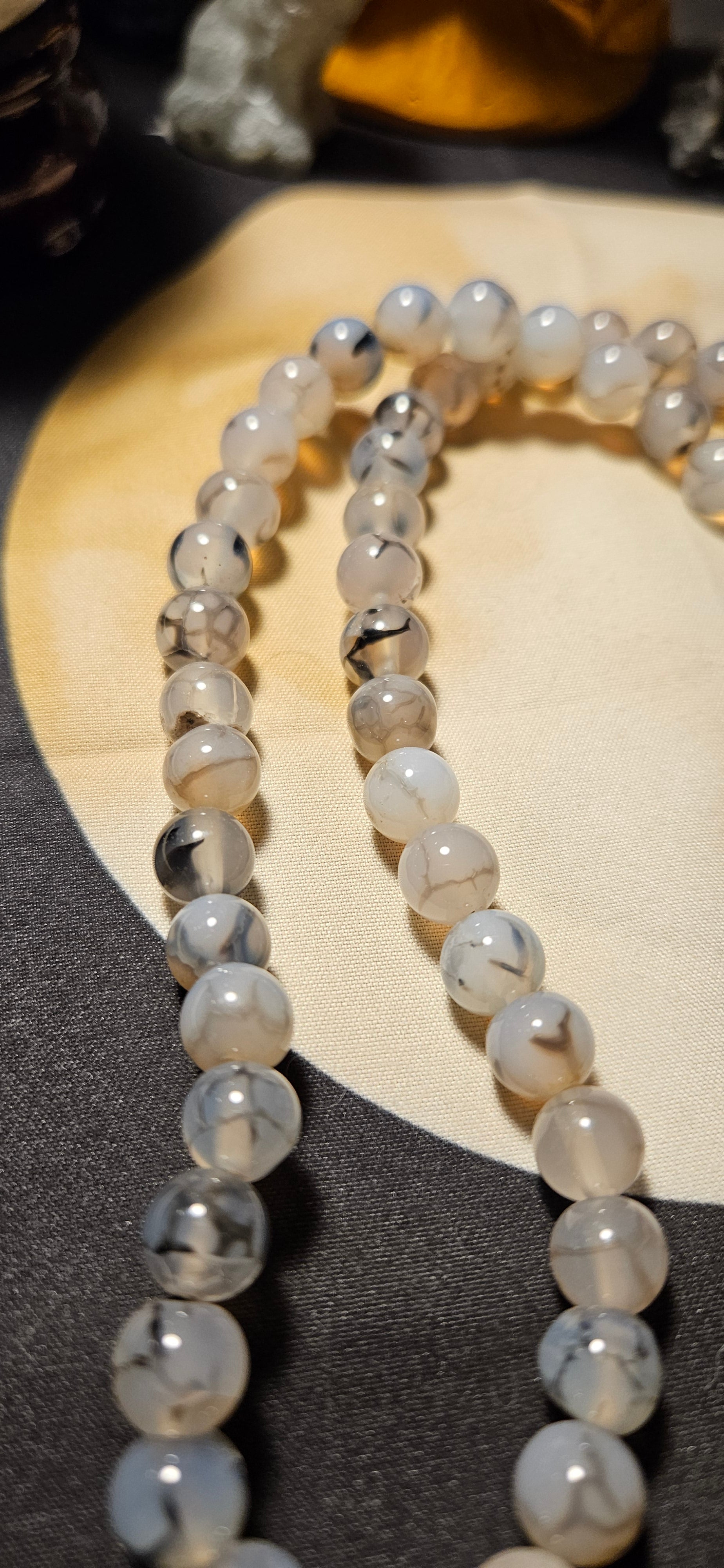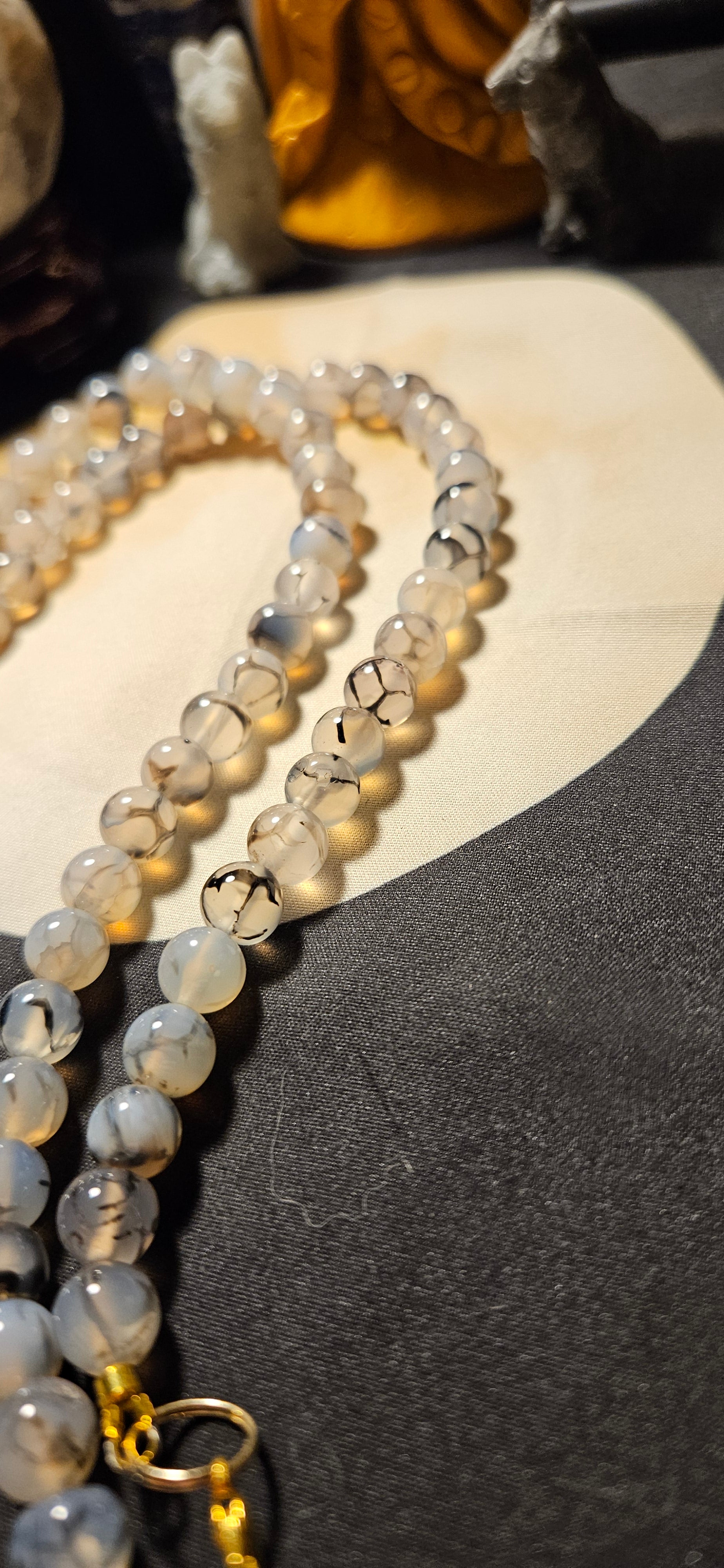 This necklace is comprised of 8mm Black Dragon Agate with a Wolf pendant howling at the moon.