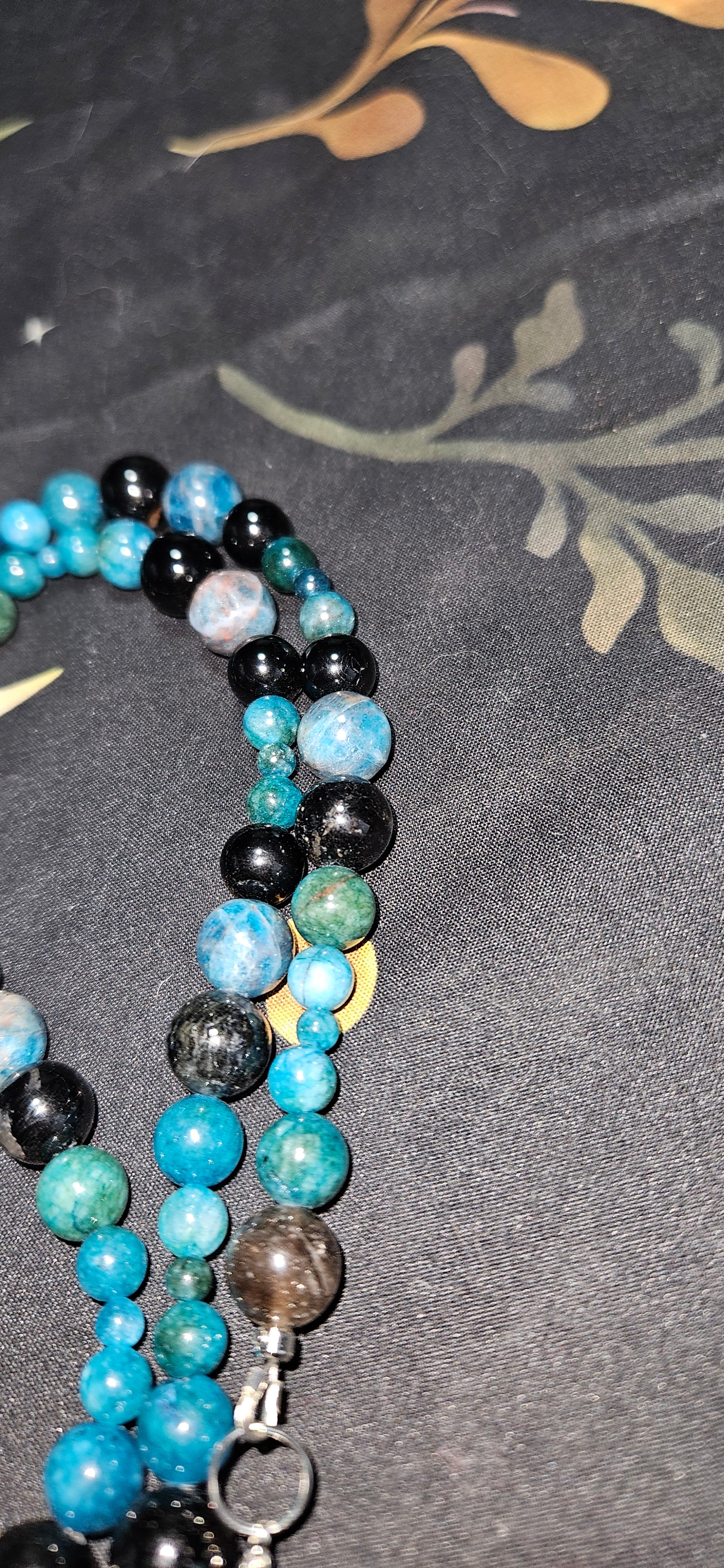 Blue Apatite, Black Tourmaline Necklace with White Cat's Eye