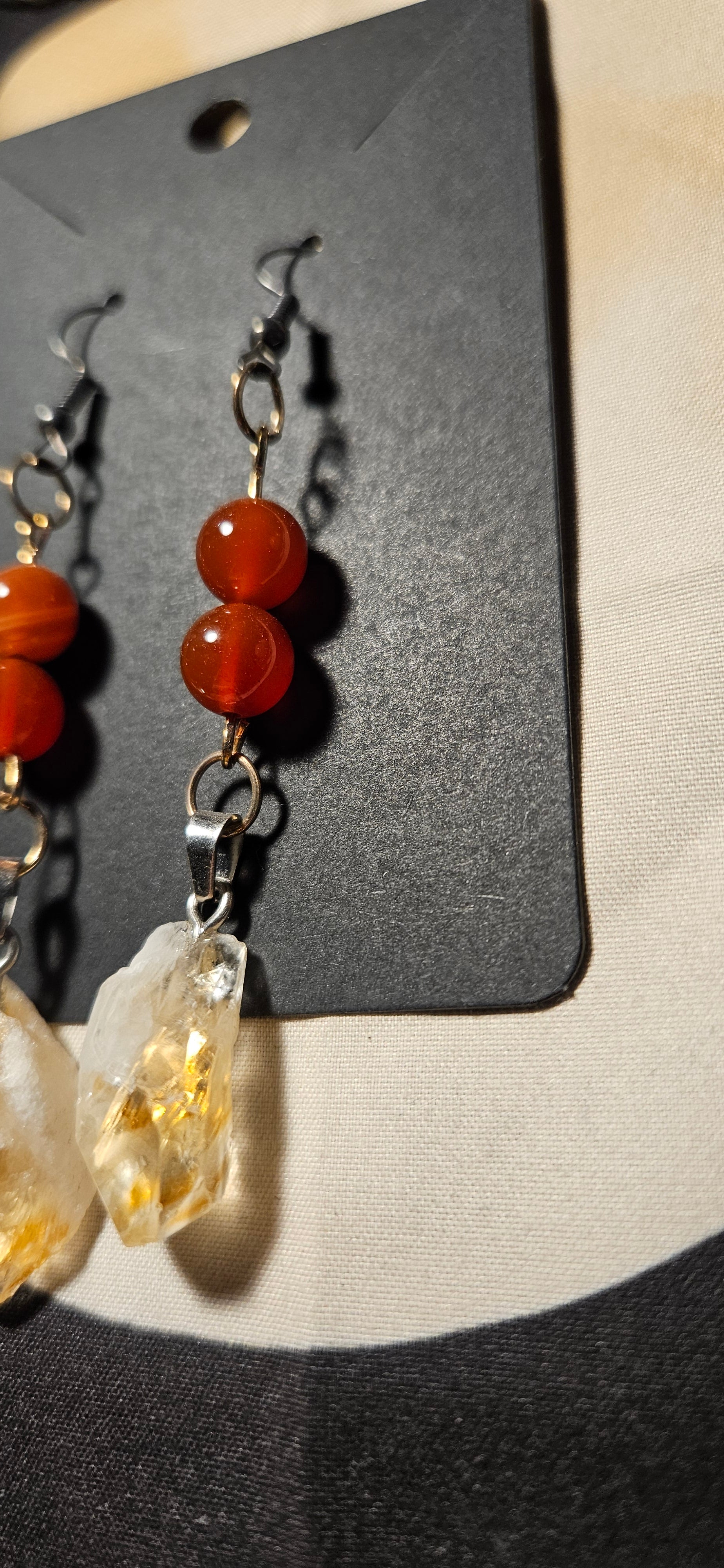 A pair of 8mm Carnelian bead earrings with Citrine raw pendants.