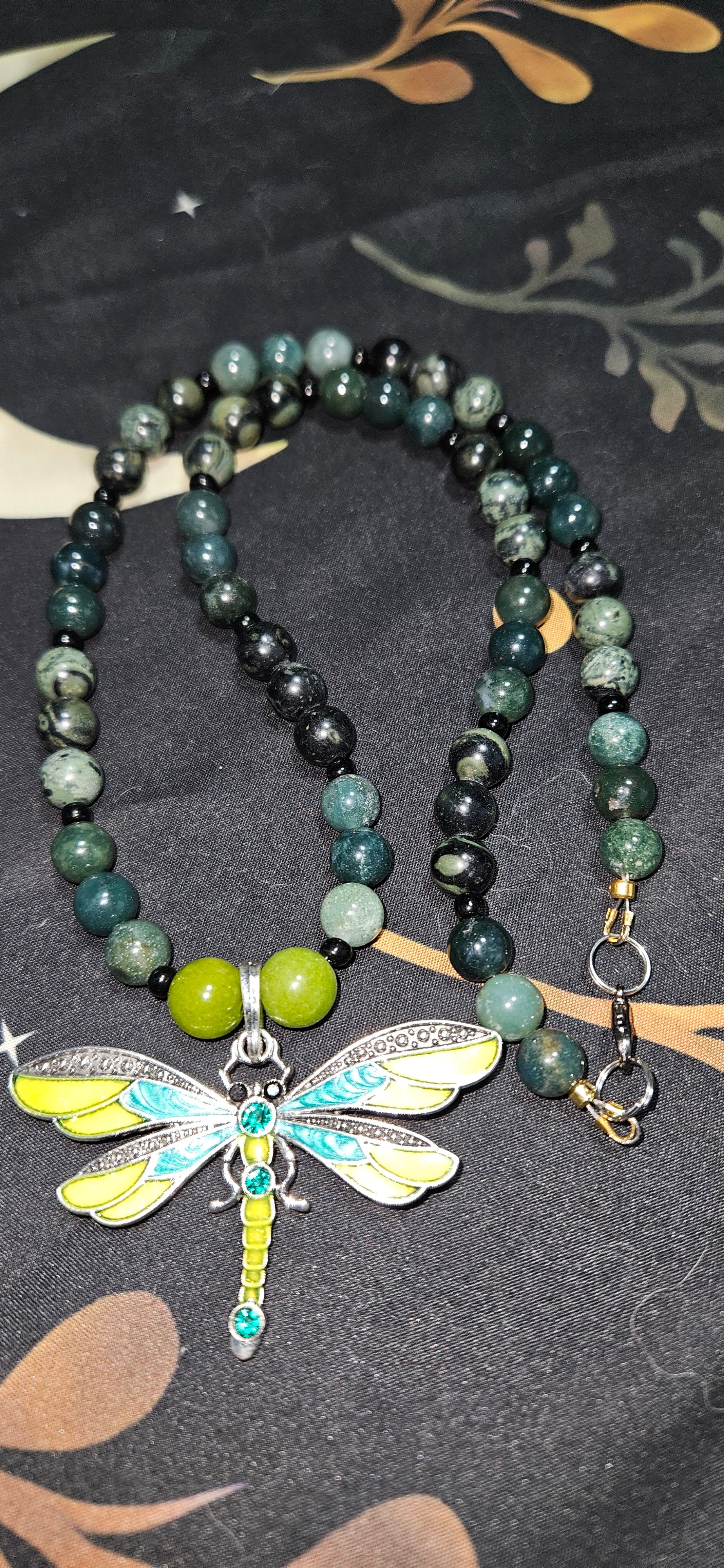 🐉🌿💚 Kambaba Jasper, Moss Agate & Peridot Beaded Necklace with Dragonfly Pendant – Growth, Harmony & Transformation (10mm & 8mm Beads)