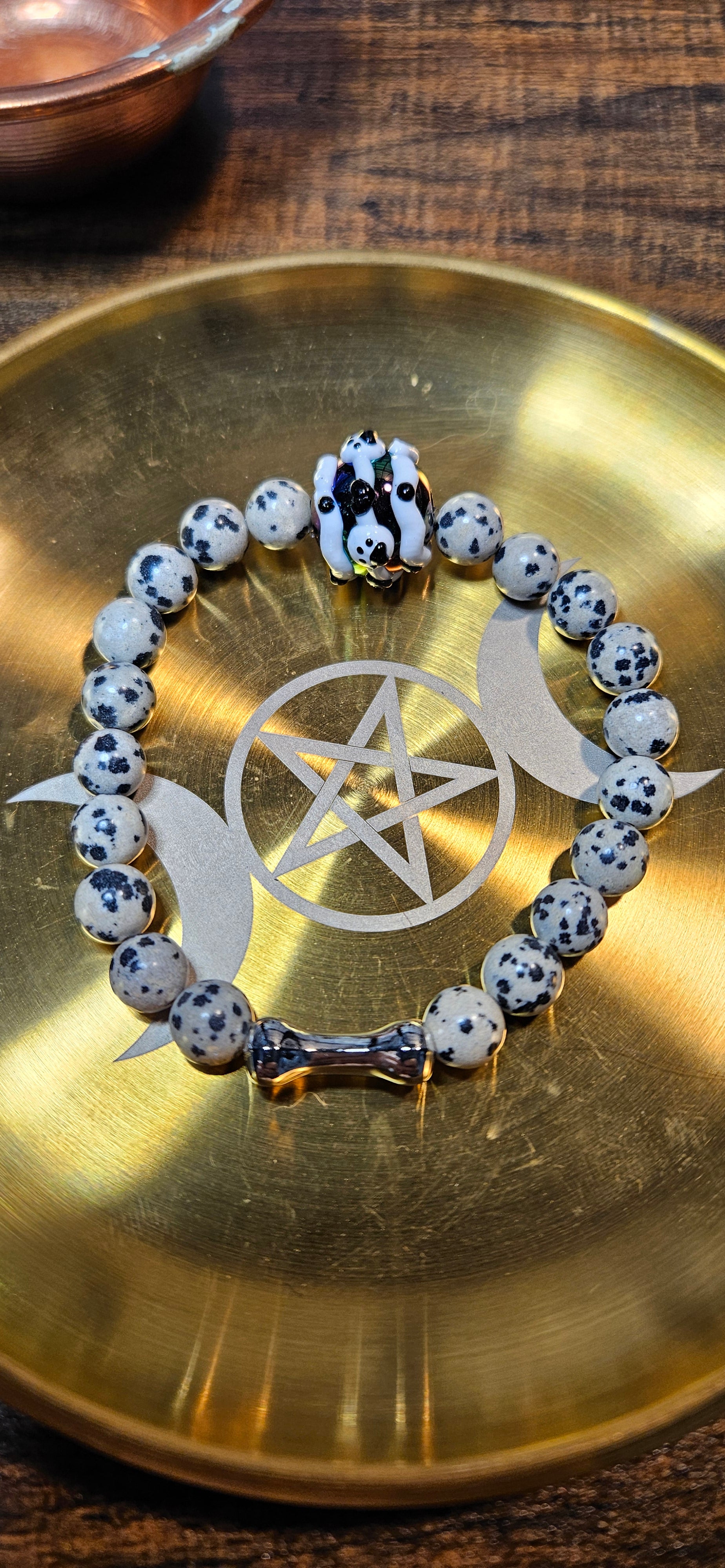 This is our Dalmation Jasper Lunar Paws #2, using a large 16mm acrylic paw-print bead for the focal point, and an acrylic bone at the base of the bracelet.