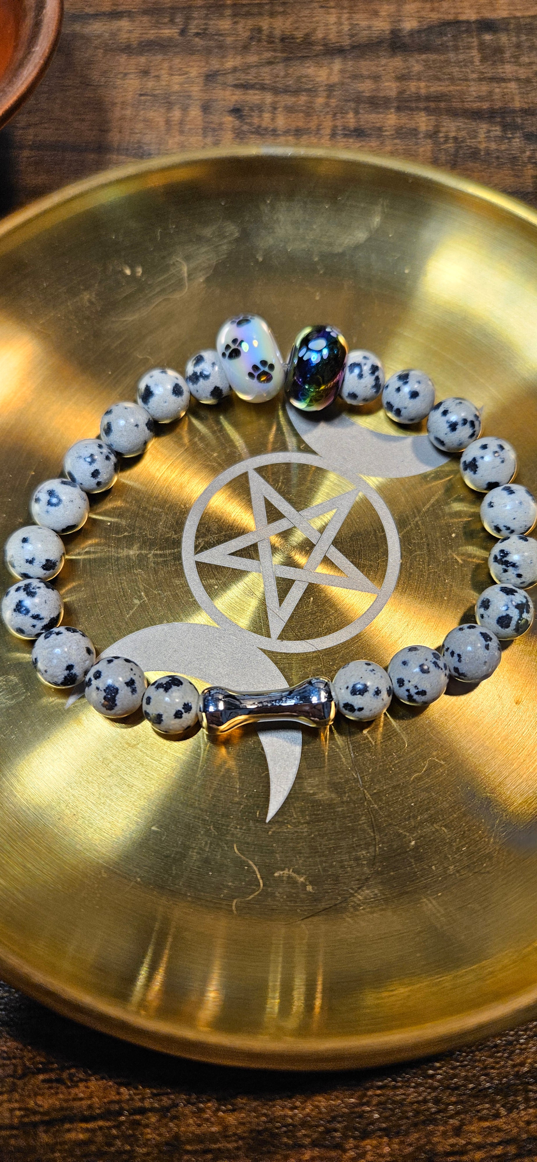 This is our Dalmation Jasper Lunar Paws #3, using two large 16mm acrylic paw-print beads, one light and one dark for the focal point, and an acrylic bone at the base of the bracelet.