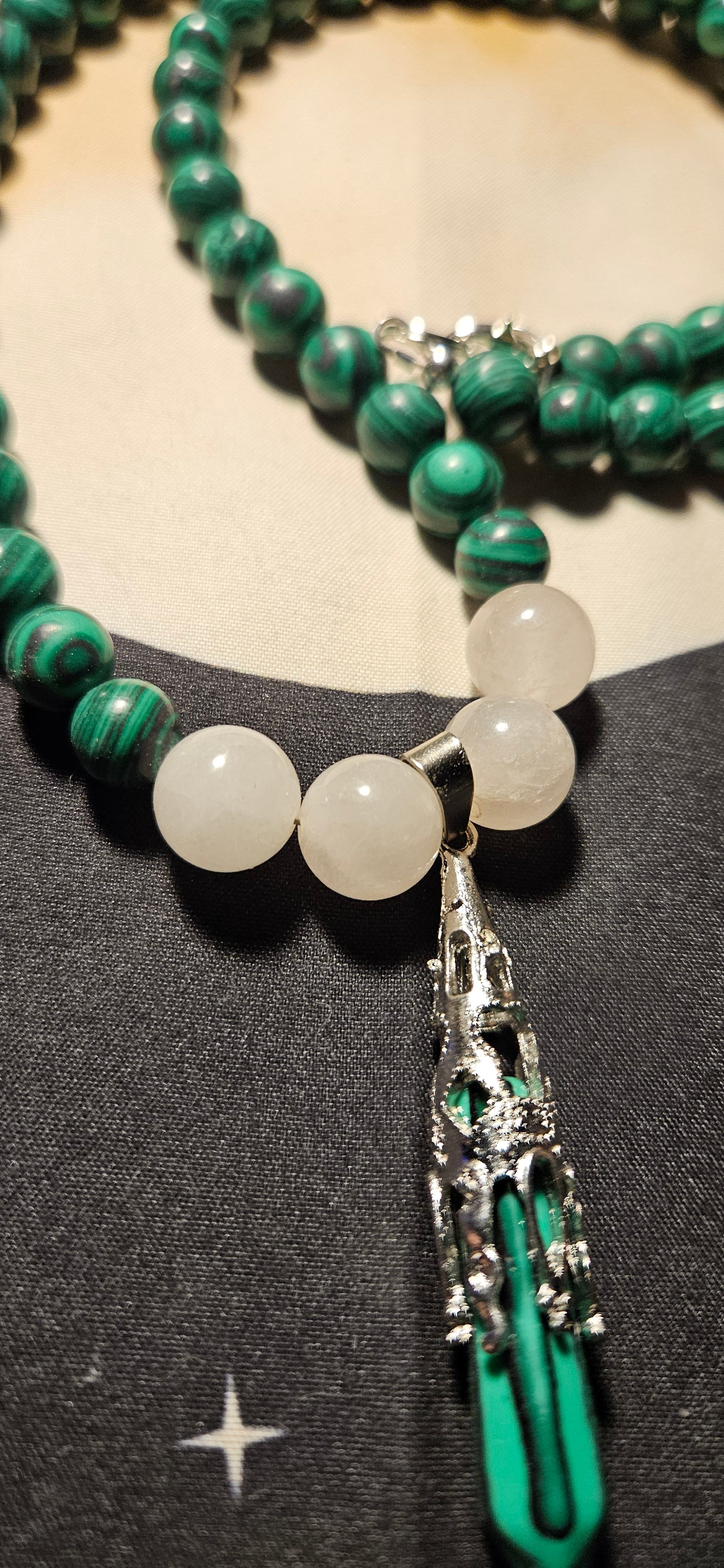 This necklace is comprised of 8mm Malachite beads, along with four 10mm Rose Quartz beads, with a Malachite pendant charm.
