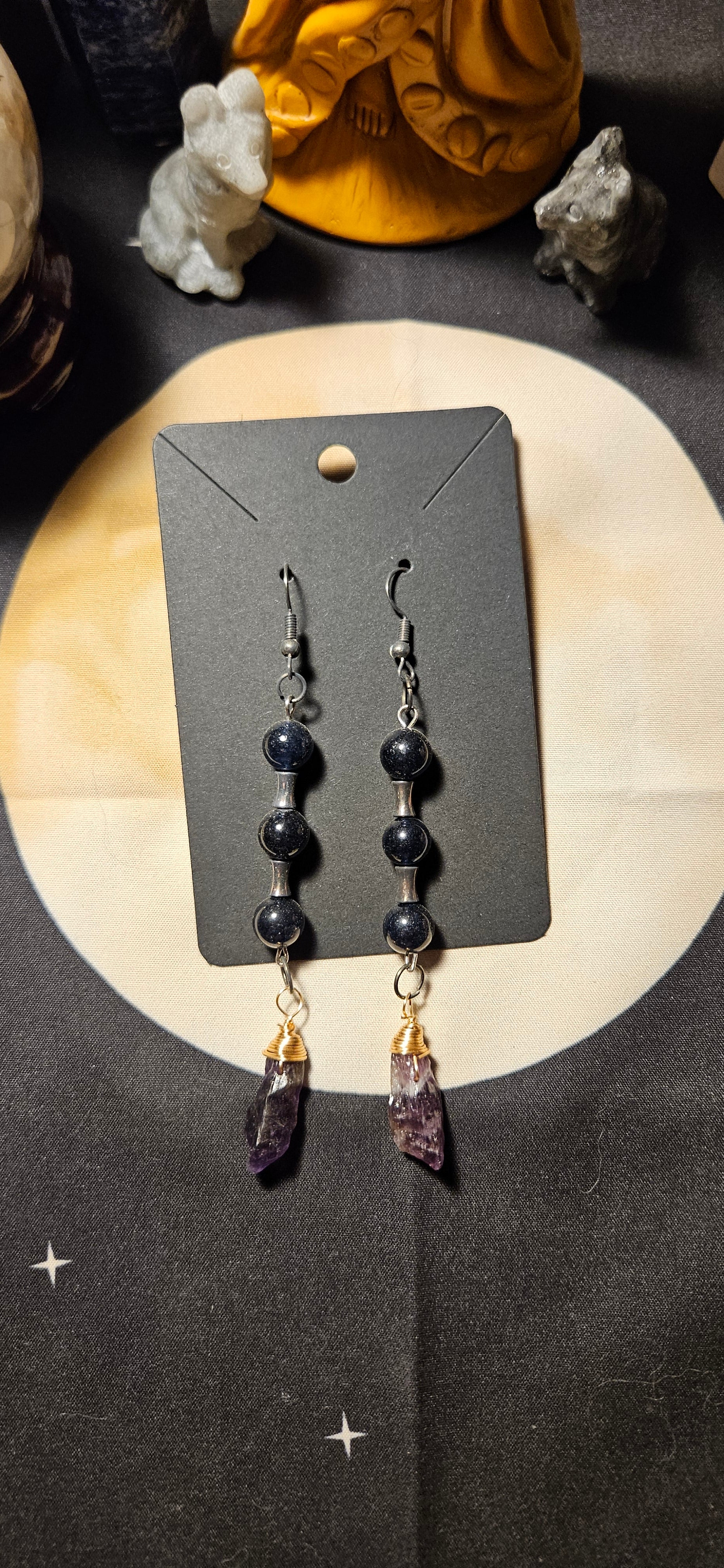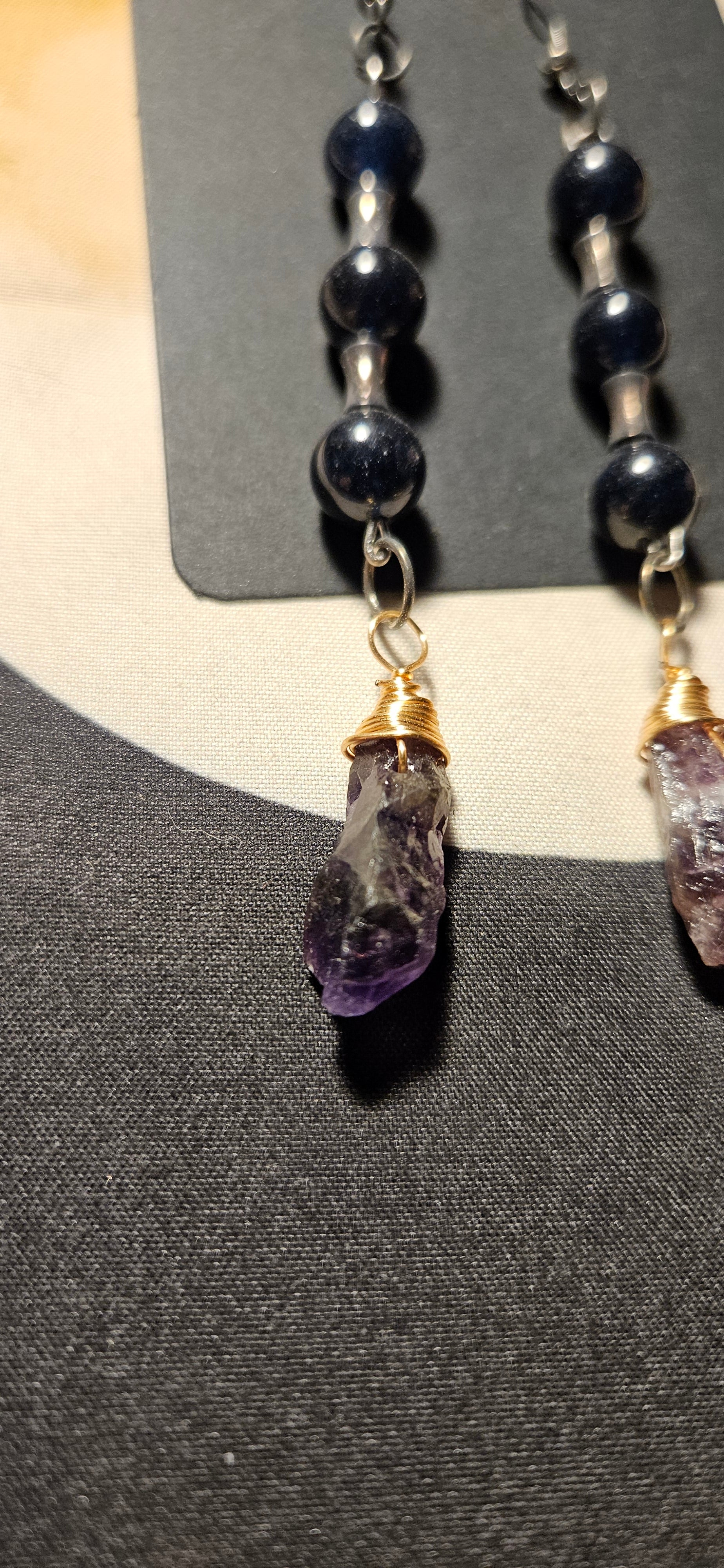 These earrings are made with 8mm Obsidian beads, with raw Amethyst pendants.
