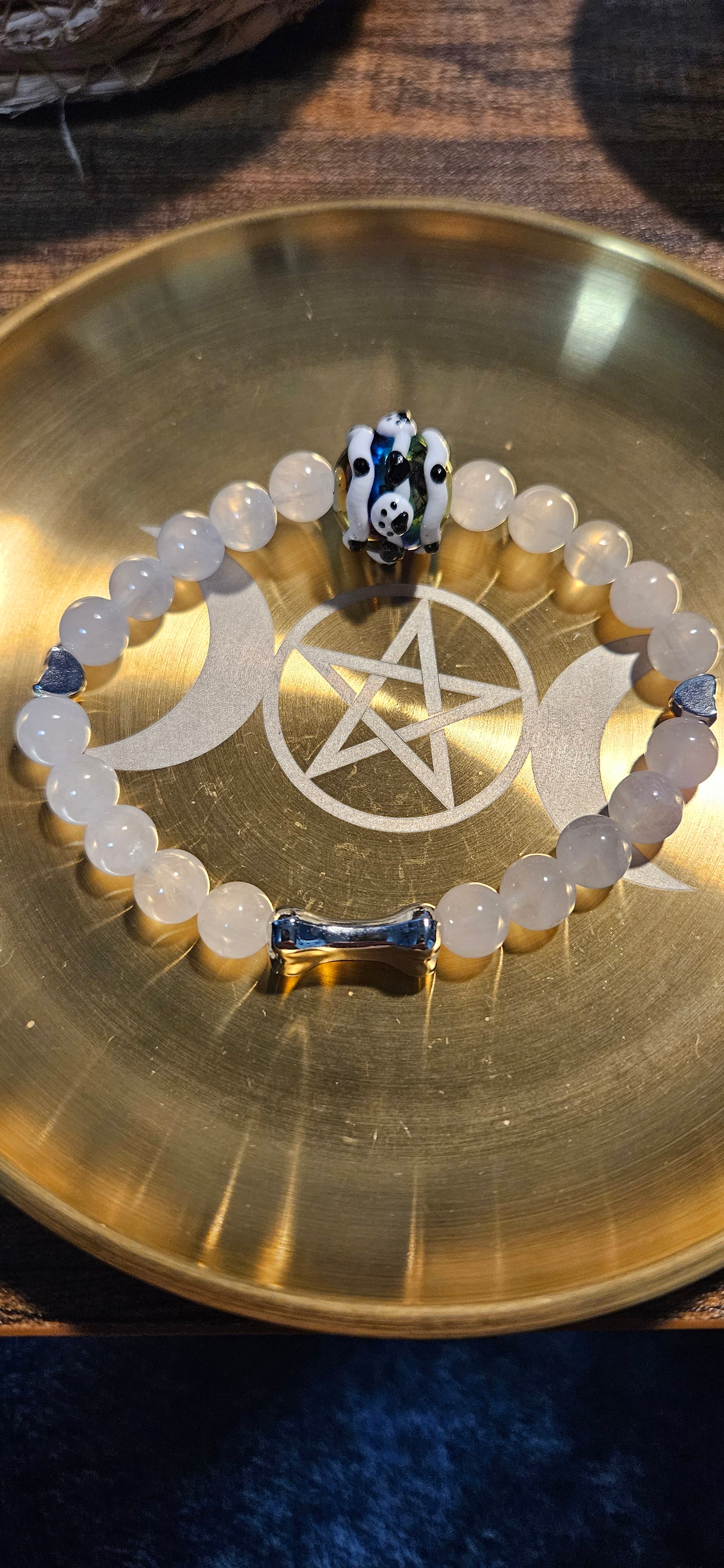 This is a Rose Quartz Lunar Paw bracelet Style 2. It has all-natural Rose Quartz 8mm beads, along with a gold or silver bone spacer at the bottom, and a large paw-print acrylic bead at the top. Colors vary slightly on the main bead!