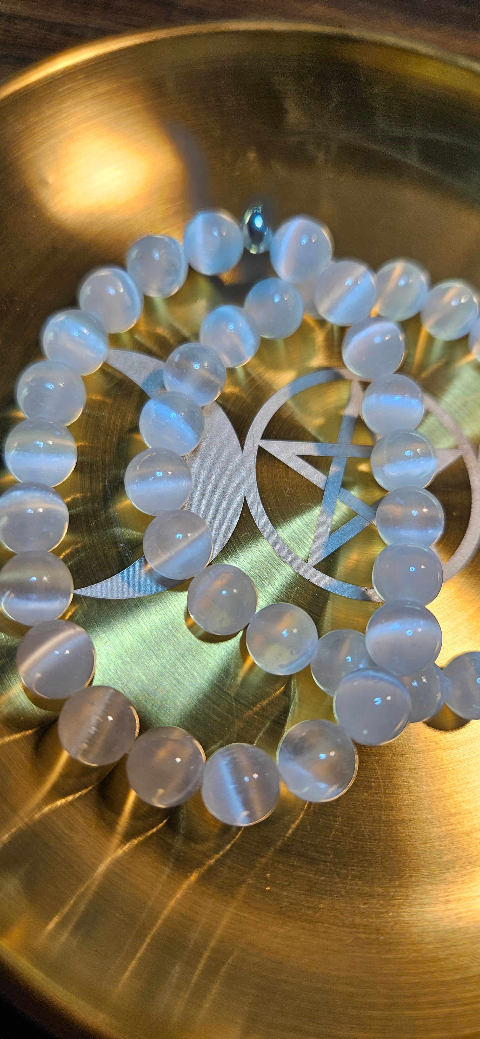 Each bead shimmers with a soft, satin-like glow — a symbol of purity, peace, and connection to higher consciousness.