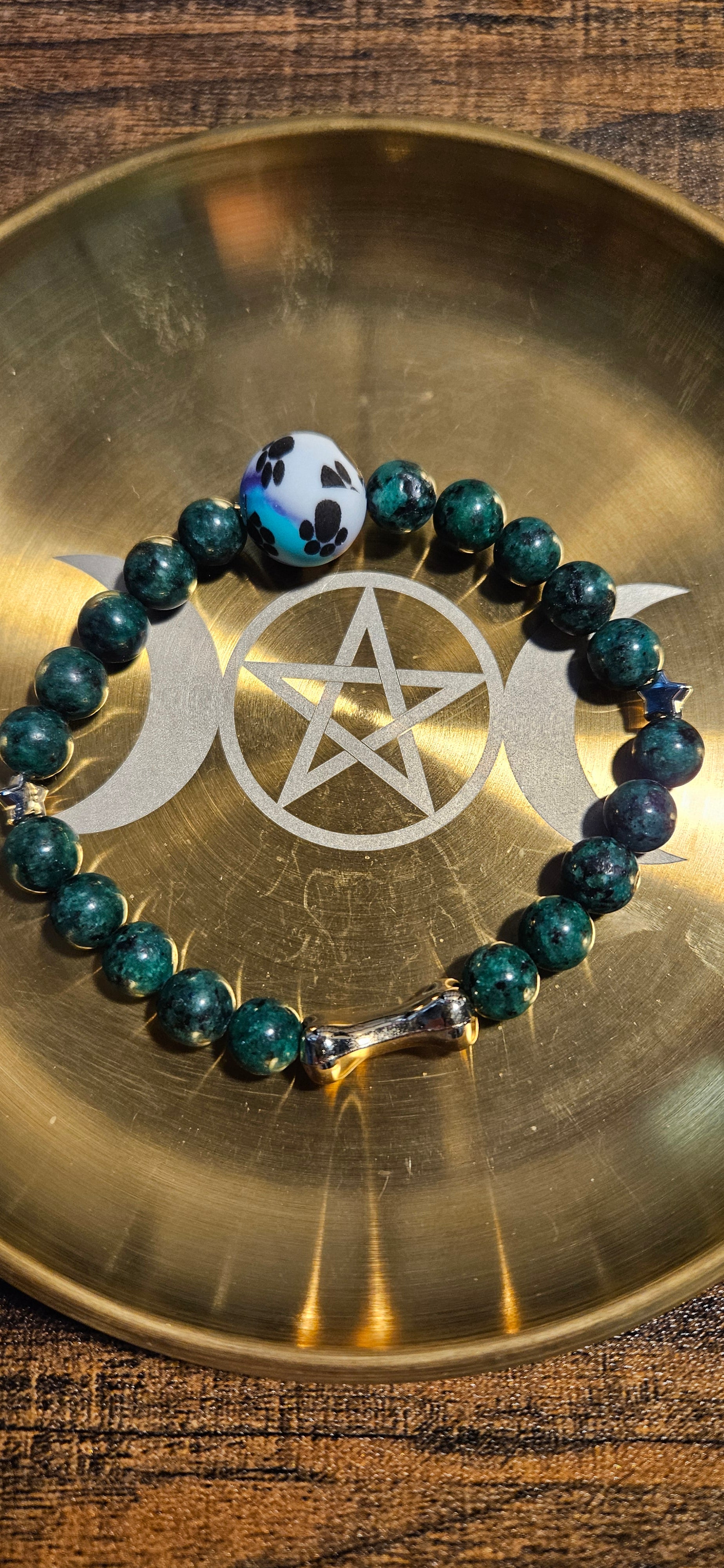 This is a Serpentine Lunar Paw bracelet Style #1. It has all-natural Serpentine 8mm beads, along with a gold or silver bone spacer at the bottom, and a large paw-print rubber bead at the top. Colors will vary on the main rubber bead!