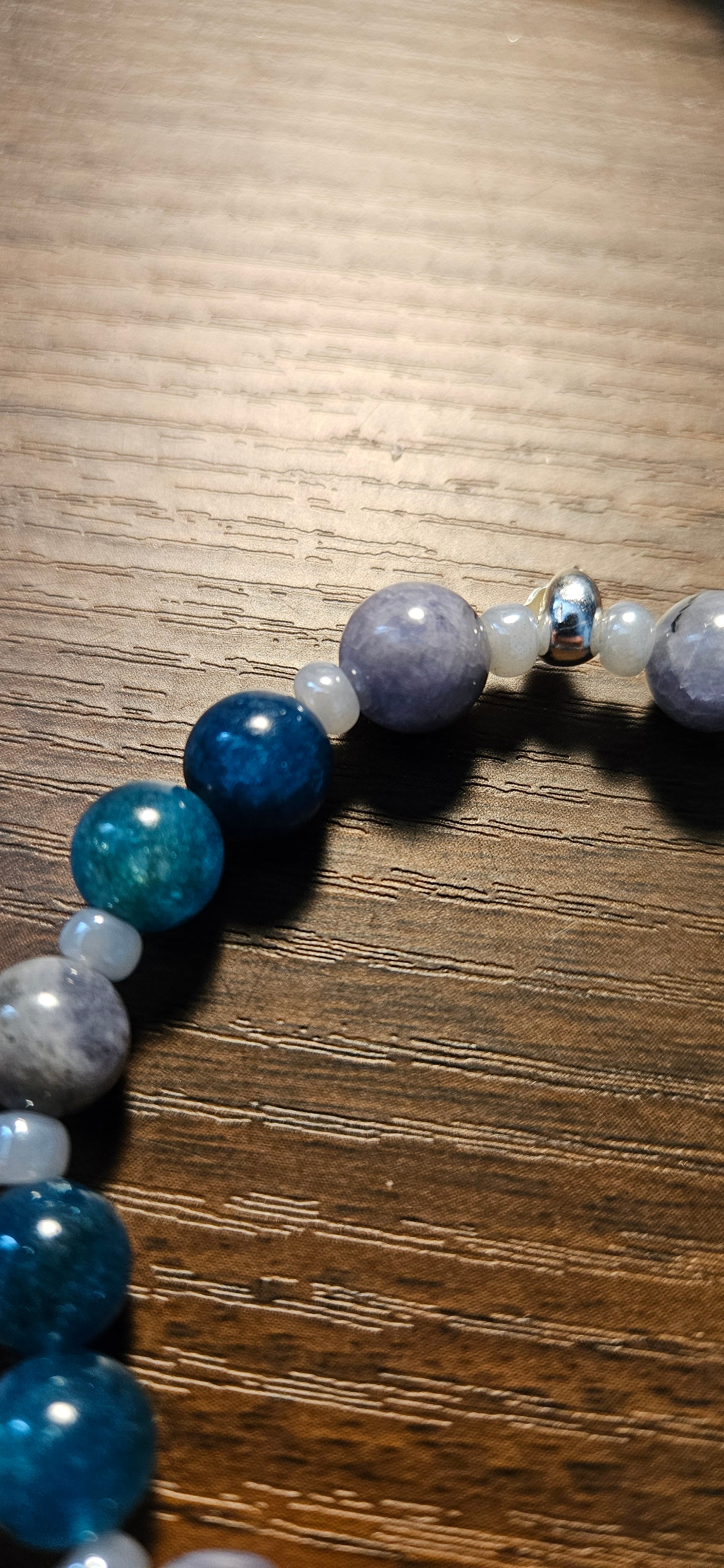 This bracelet is a beauty. I LOVE Blue Apatite, and Tanzanite is one of those crystals that screams with character. This is a VERY limited edition piece. The Blue Apatite are set in 8mm beads, and the Tanzanite is ALSO 8mm beads.