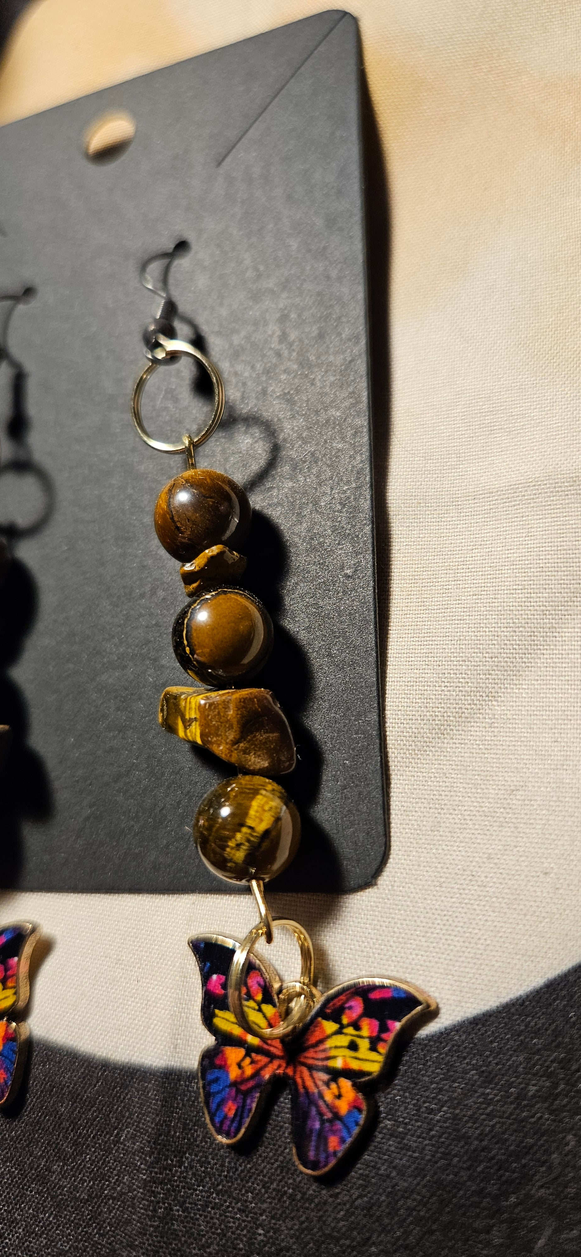 These earrings are made from 8mm Tiger's Eye beads, Tiger's Eye chipped stone, and colorful butterfly charms.